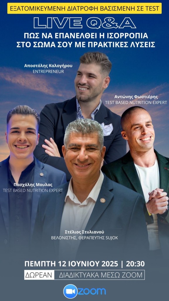 Αυτή την Πέμπτη 12/6 και ώρα 20:30, έχεις μια μοναδική ευκαιρία να παρακολουθήσεις μια ΔΩΡΕΑΝ ζωντανή παρουσίαση μέσω Zoom και να ανακαλύψεις μια φυσική, επιστημονικά τεκμηριωμένη προσέγγιση για την υποστήριξη της υγείας σου, που ήδη βοηθά χιλιάδες ανθρώπους σε όλο τον κόσμο.