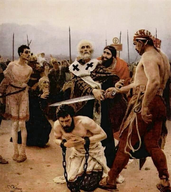 *Στη Ρωσία των τελών του 19ου αιώνα και μέσα σε ένα κλίμα έντονης αντιπαράθεσης σχετικά με την κατάργηση ή μη της θανατικής ποινής, ο Ilya Repin θέλησε να εκφράσει την άποψή του, αποτυπώνοντας στον πίνακα αυτό, τον Άγιο Νικόλαο να αποτρέπει την εκτέλεση του θανατοποινίτη, ενώ παράλληλα αγνοεί του αξιωματούχο που τον παροτρύνει να επιτρέψει να εκτελεστεί η εντολή της εξουσίας.